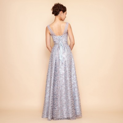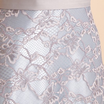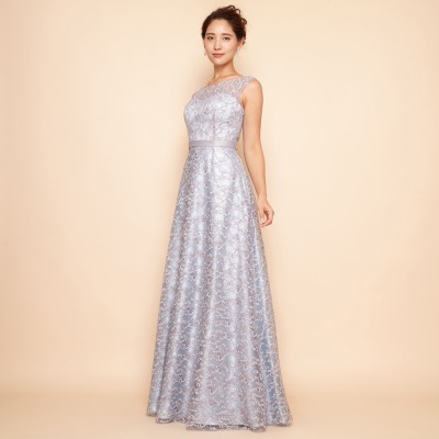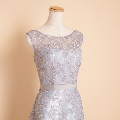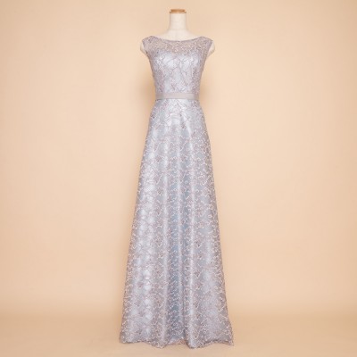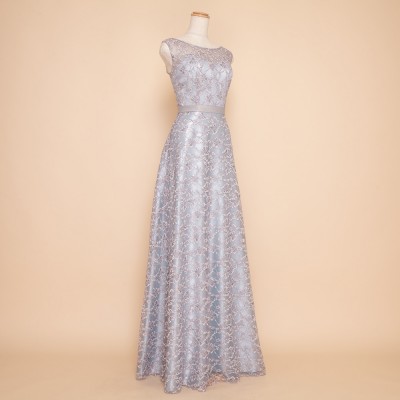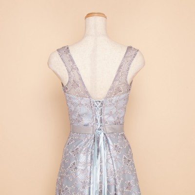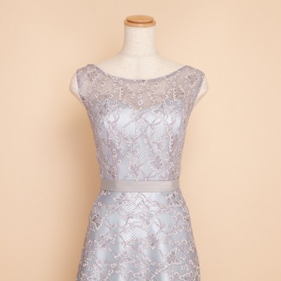 美しく体にフィットする、上品な総レース仕立てのステージドレス。スカイブルーのサテン生地にシルバーグレーのレースを重ねて上品な色合いに仕上げました。レースには繊細に光るラメ糸が織込んでいる箇所があるので程よい光沢感が楽しめます。パーティドレスやオーケストラ用ドレスなどに使いやすい、シンプルなデザインです。