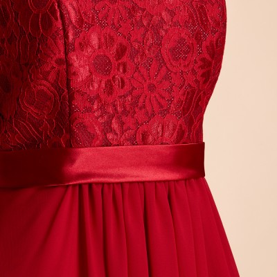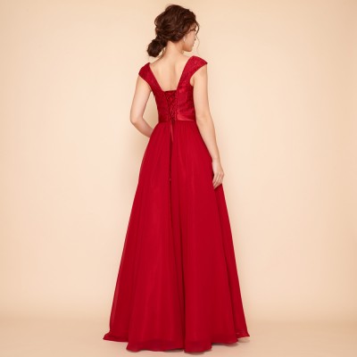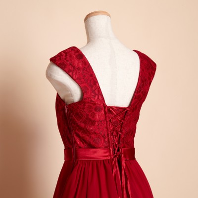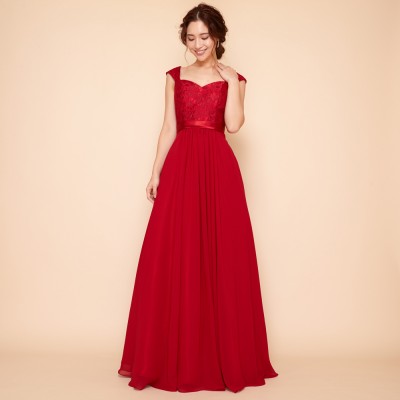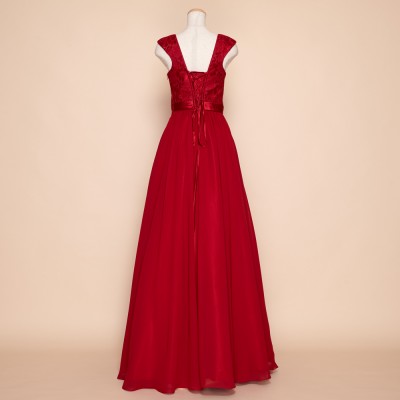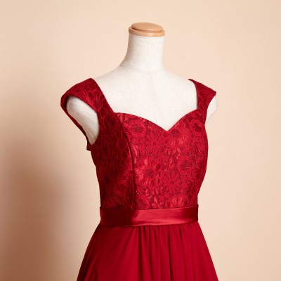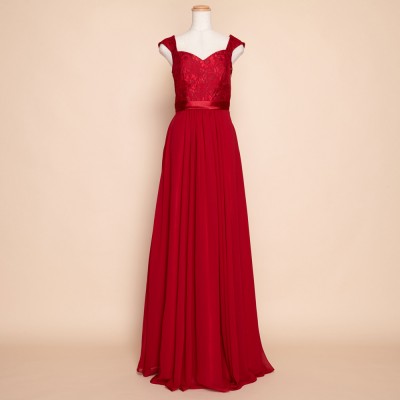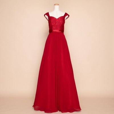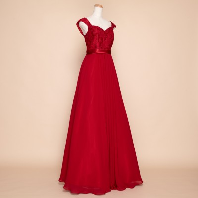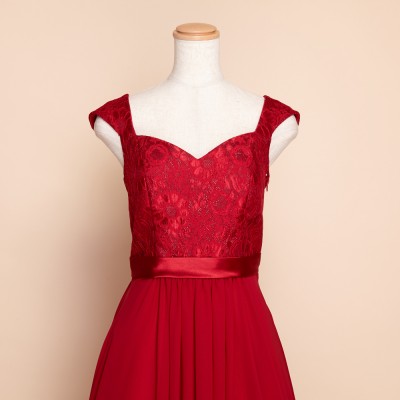 幅広のショルダーがポイントのシンプルなシフォンスカートのドレスです。ラメ糸入りのフラワーレースを上見頃に使用することで控え目な可憐さをプラス。レッドはとても華やかで明るい雰囲気を演出しますのでクリスマスコンサートなどにもおすすめですよ!