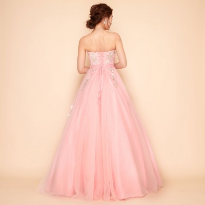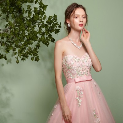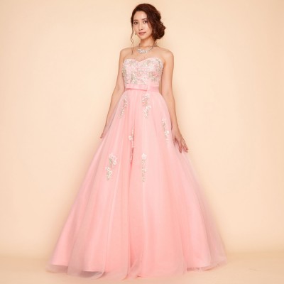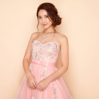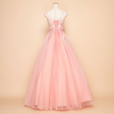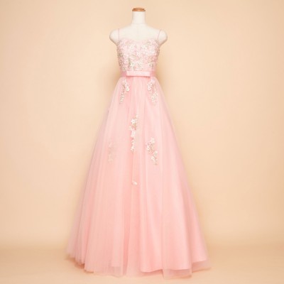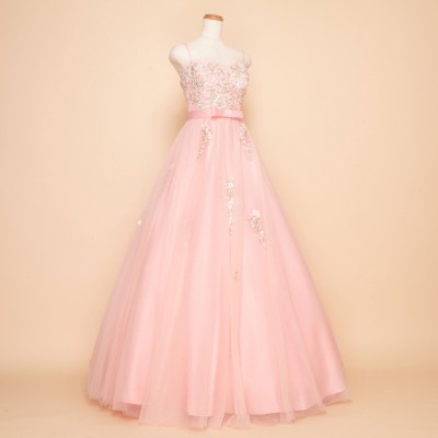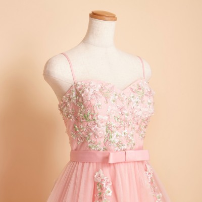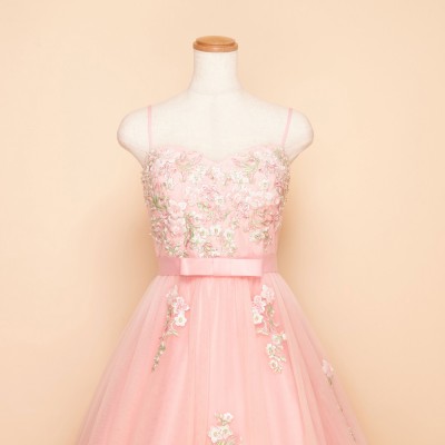 胸元に刺繍と立体フラワーモチーフをふんだんに散りばめ、スカートにも同様の装飾を施したプリンセスドレス。大きく広がるチュールスカートがとても可憐です。ウエストにはリボンモチーフをプラスしより一層可愛らしいお姫様のような雰囲気に。とってもキュートなベピーピンクカラードレス。演奏会ドレスとしてはもちろん、花嫁様のお色直しドレスとしてもおすすめです。