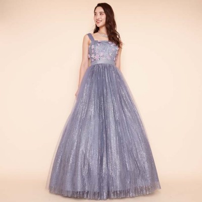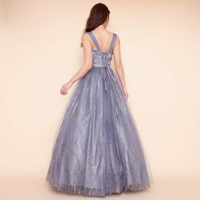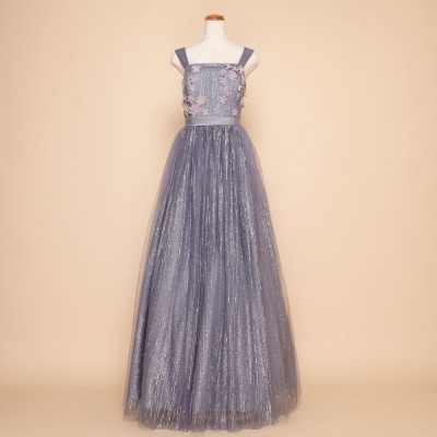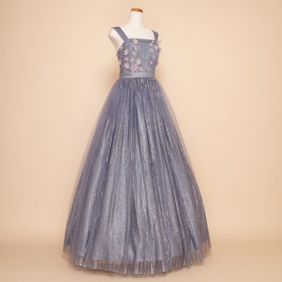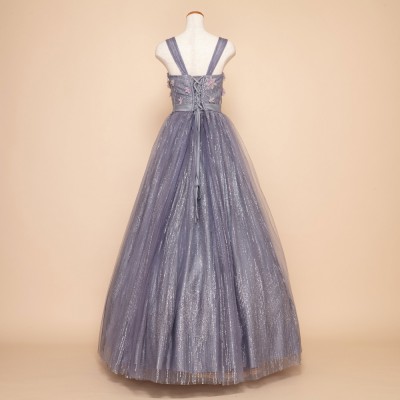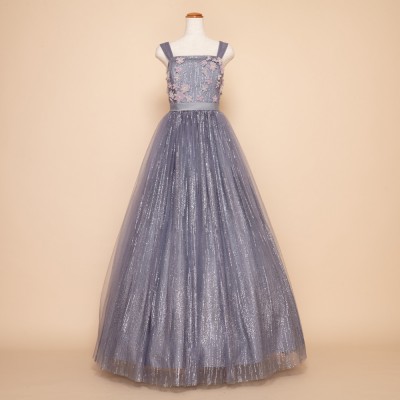 個性的なスモーキーカラーのキラキラグリッターのステージドレスです。少し重量のあるデザインですが、幅広の肩紐は安定感があるのでどなたでも安心してご着用いただけます。パニエ無しでも程よくスカートが広がりますが、お好みに合わせてパニエをご使用いただければさらに豪華な印象に。