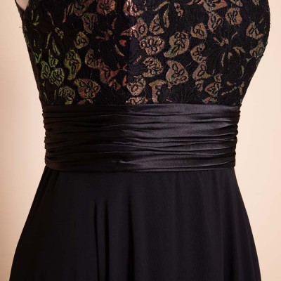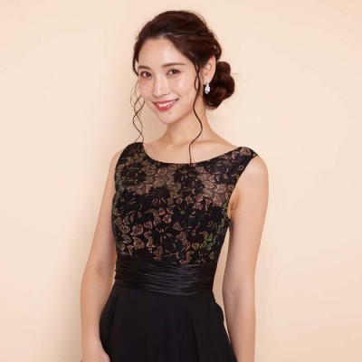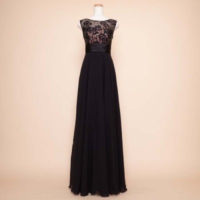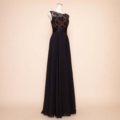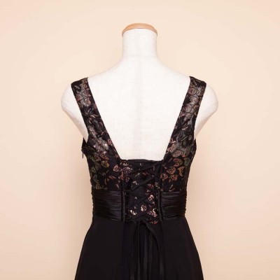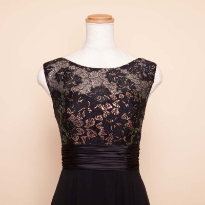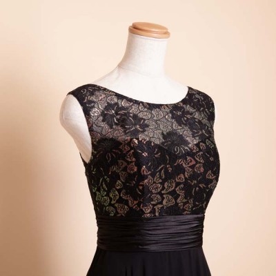 角度によって色が変わるオーロララメレースを使用した光沢の美しいスレンダーラインロングドレスです。スカートにはふんわりと自然に広がるシフォンを使用し、軽やかで女性らしくエレガントな雰囲気になる様デザインしました。シンプルにすっきりと着こなせるので、ステージドレスやパーティドレス、ジャケットを羽織ってマザーズドレスとしてなど幅広い用途にご着用いただけます。ブラックはオーロラの光沢が他のカラーより映えるので、パーティドレスに特におすすめです。