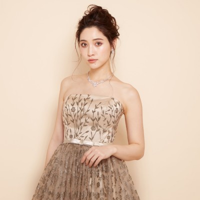動く度にキラキラと華やかに輝くグリッターチュールには小花柄が描かれており大人の中にも可愛らしさを演出できる1枚に仕上がっております。