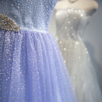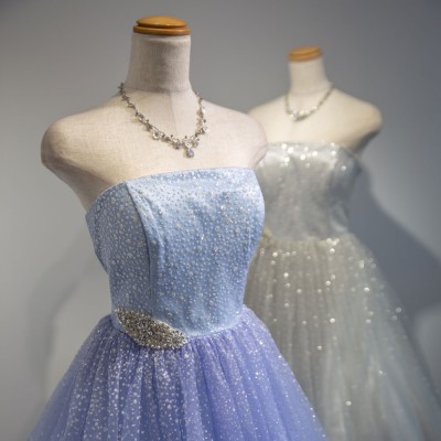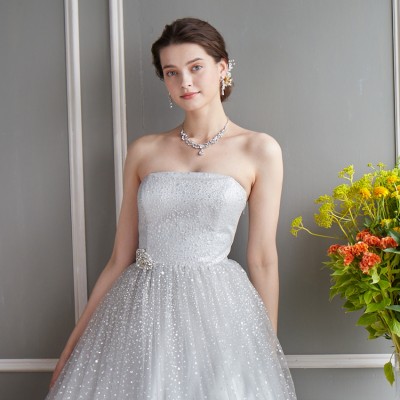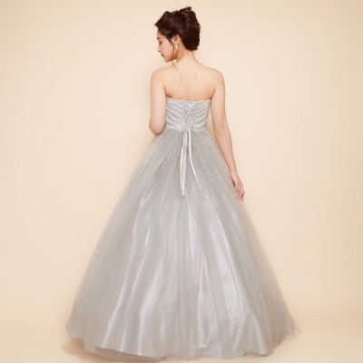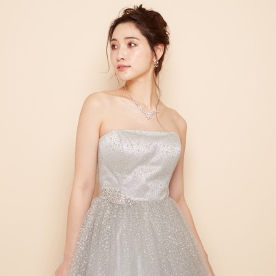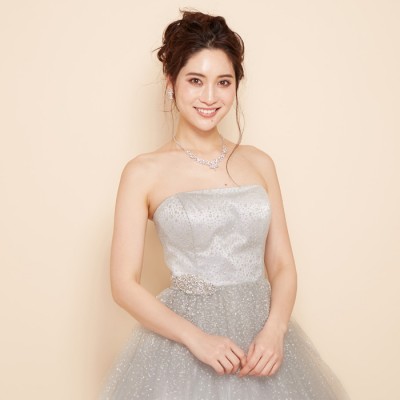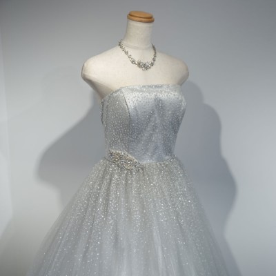 降り注ぐ氷の結晶のようなシルバーグリッターが輝くプリンセスドレス。ボリュームのあるチュールスカートは美しくも儚げな印象です。ウエストにワンポイントの装飾を施し、ウエスト位置を高くみせることでスタイルアップの効果も。上品でエレガントなシルバーグラデーションは、華やかさの中にも芯のあるクールな印象の大人カラーです。
