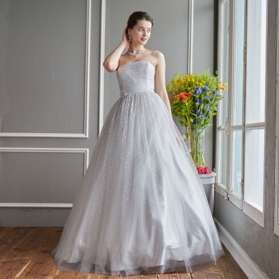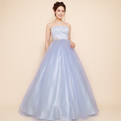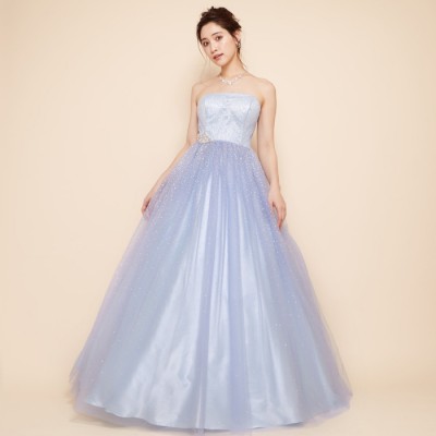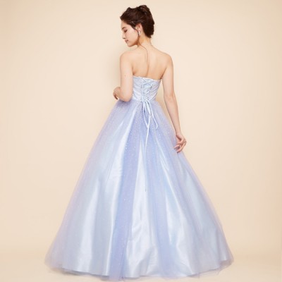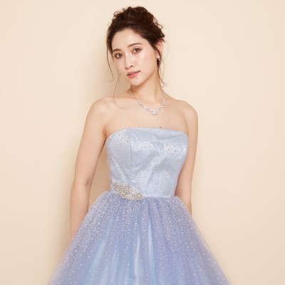 降り注ぐ氷の結晶のようなシルバーグリッターが輝くプリンセスドレス。ボリュームのあるチュールスカートは美しくも儚げな印象です。ウエストにワンポイントの装飾を施し、ウエスト位置を高くみせることでスタイルアップの効果も。華やかで繊細なブルーグラデーションは童話のお姫様を思わせる幻想的なカラーです。