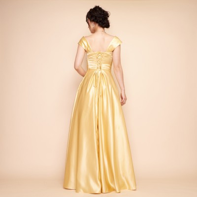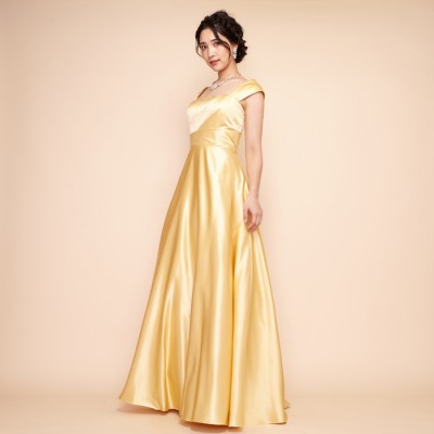 しっとりとした厚手サテンを使用したシンプルデザインのステージドレス。サテン特有のリッチな光沢はとても高級感があります。幅広の肩紐付きなので初めてドレスを着る方も安心してご着用いただく事ができ、また、この肩紐は着脱タイプなのでガラッと雰囲気を変えたベアトップドレスへとイメージチェンジも可能です。華やかで輝かしいシャインイエローカラー。
