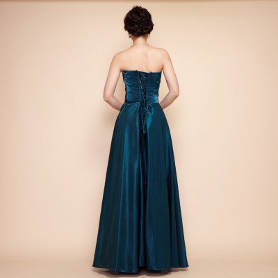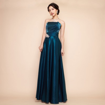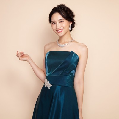 艶のある独特でシャイニーな光沢のサテン生地を使用したスタイリッシュなスレンダードレス。シンプルになり過ぎないよう、ウエストにはシルバーのフラワーモチーフをあしらいました。ステージドレスやパーティドレスとしてぜひご活用ください。秋冬の演奏会にマッチする深みのあるディープグリーンカラードレス。