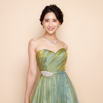 見る角度によって色が変わる艶めきオーガンジーは、まるでオーロラのベールを纏ったかのような雰囲気。軽やかな着心地とシンプルなデザインは季節問わずに着用出来るので着回し力も抜群です。ワンポイントのウエストモチーフがさりげなく輝き、しっとりと落ち着いた大人の女性に良く似合うドレスに仕上げました。オーロラカラーとシックなオリーブグリーンの個性的な配色が魅力のカラードレス。