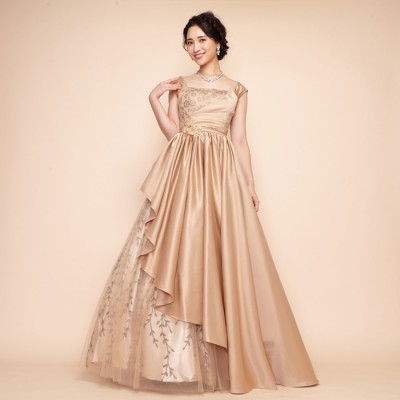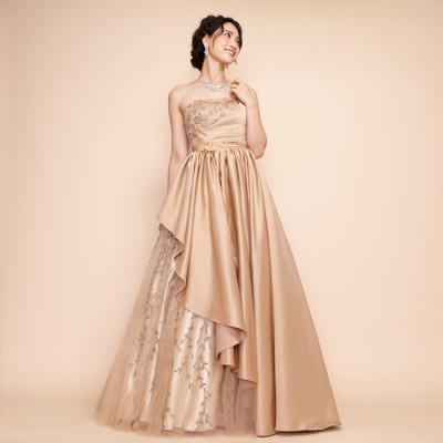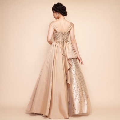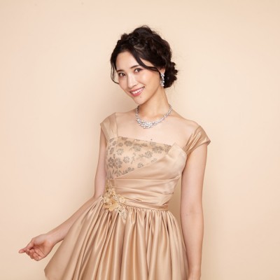 アシンメトリーなレイヤースカートには滑らかな手触りのリッチサテンを使用した、ラグジュアリーボリュームドレス。胸元やスカートにフラワーとリーフを合わせたデザイン性ある煌めきグリッターを配し、お洒落感をプラスしました。肩紐は取り外し可能なタイプなので、ステージや曲によってイメージを変えて着用できます。派手目なデザインでも、トーンを落としたくすみカラーならトライしやすいのでいつもと雰囲気を変えたい方にぜひおすすめしたいドレスです。アラビアンな雰囲気漂うゴールドベージュカラー。