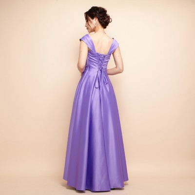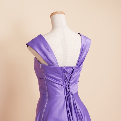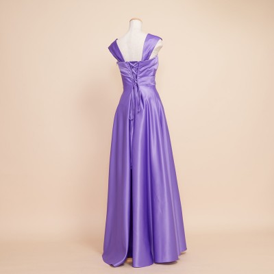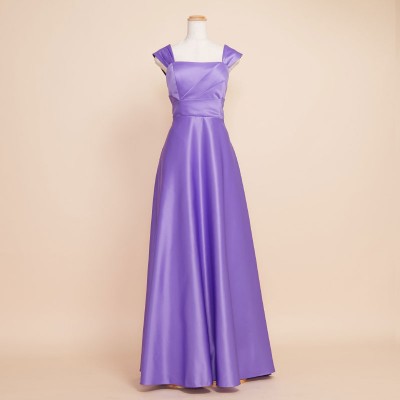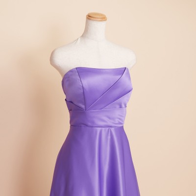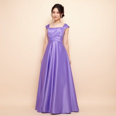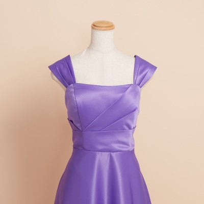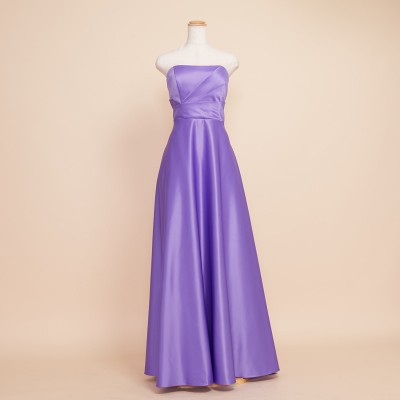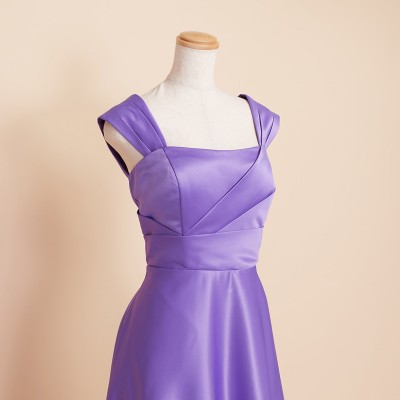 しっとりとした厚手サテンを使用したシンプルデザインのステージドレス。サテン特有のリッチな光沢はとても高級感があります。幅広の肩紐付きなので初めてドレスを着る方も安心してご着用いただく事ができ、また、この肩紐は着脱タイプなのでガラッと雰囲気を変えたベアトップドレスへとイメージチェンジも可能です。パニエでスカートをふわっと広げれば、ソロステージ用ドレスとしても充分見映えが良いお衣装になります。藤の花のようなクールなパープルカラー。