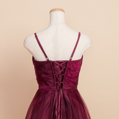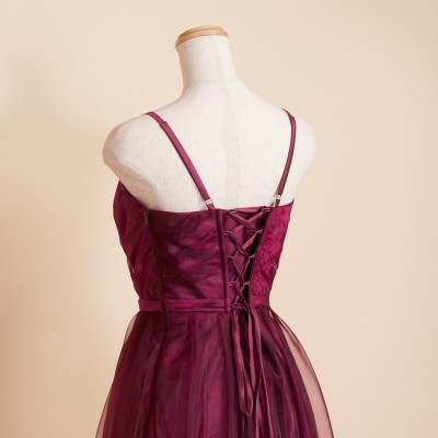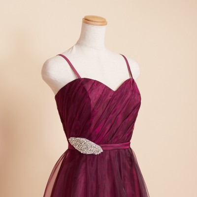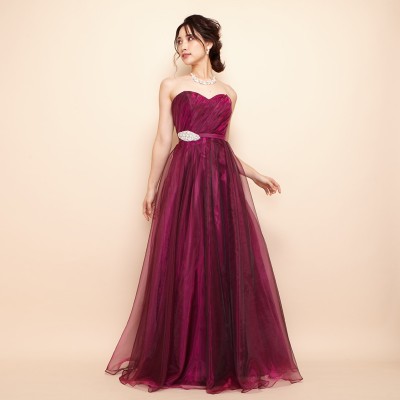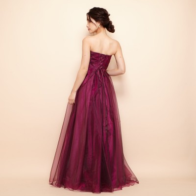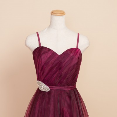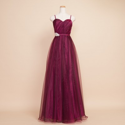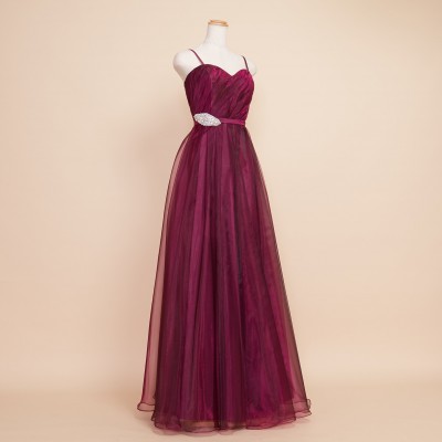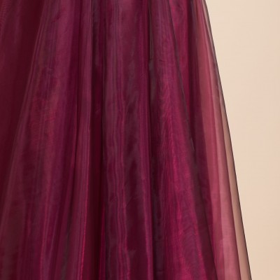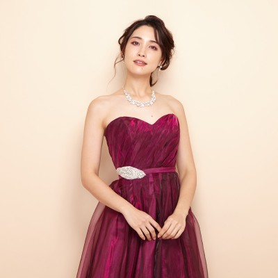 見る角度によって色が変わる艶めきオーガンジーは、まるでオーロラのベールを纏ったかのような雰囲気。軽やかな着心地とシンプルなデザインは季節問わずに着用出来るので着回し力も抜群です。ワンポイントのウエストモチーフがさりげなく輝き、しっとりと落ち着いた大人の女性に良く似合うドレスに仕上げました。熟した赤ぶどうのような芳醇で深みのあるオーロラレッドパープル