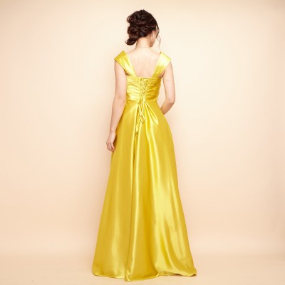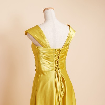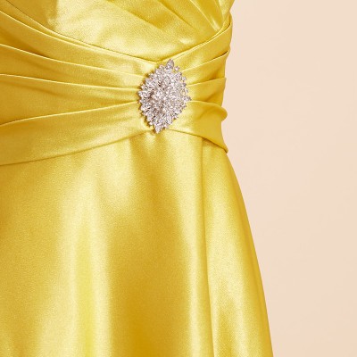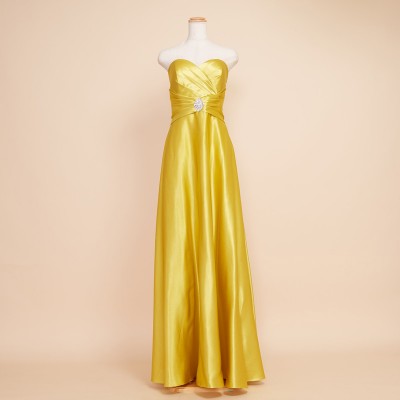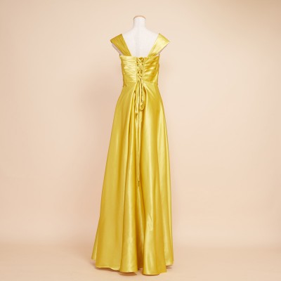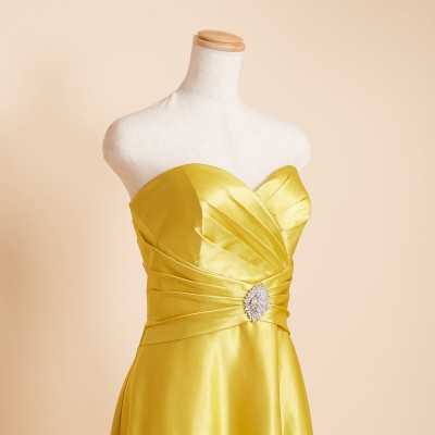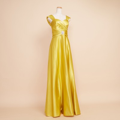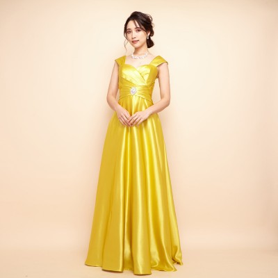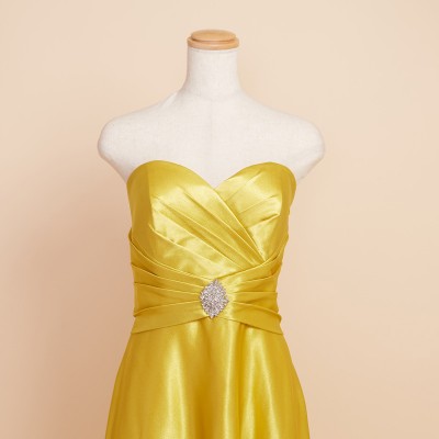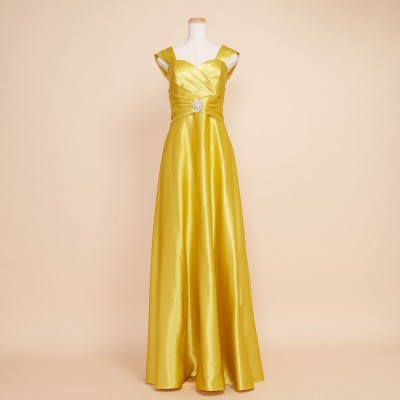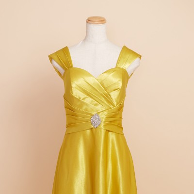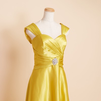 滑らかな手触りのシャイニーサテンを使用したウエストクロスデザインのスレンダードレス。程よくシェイプされたウエストにワンポイントのシルバービジューブローチが付属。ショルダーとブローチは取り外し可能なので、ブローチをお好みの位置に付け替えたり、ショルダーを外してシンプルに着用したりとアレンジの幅もグッと広がります。エレガントで個性的なシャイニーマスタードカラー。