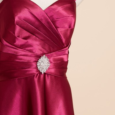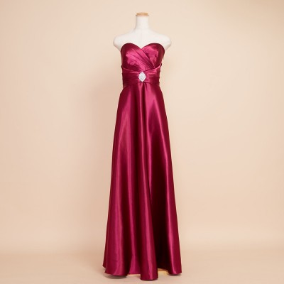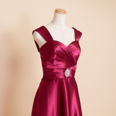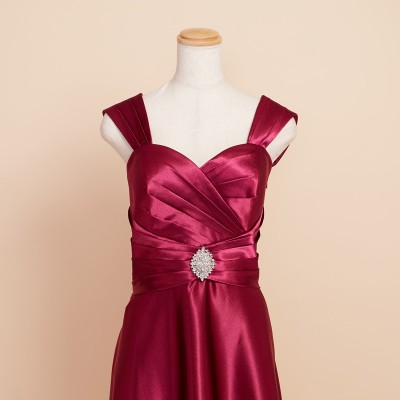滑らかな手触りのシャイニーサテンを使用したウエストクロスデザインのスレンダードレス。程よくシェイプされたウエストにワンポイントのシルバービジューブローチが付属。ショルダーとブローチは取り外し可能なので、ブローチをお好みの位置に付け替えたり、ショルダーを外してシンプルに着用したりとアレンジの幅もグッと広がります。フーシャのような明るい光沢が魅力的なワインレッドカラー。