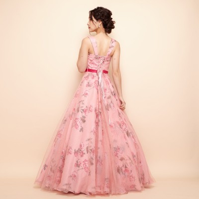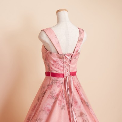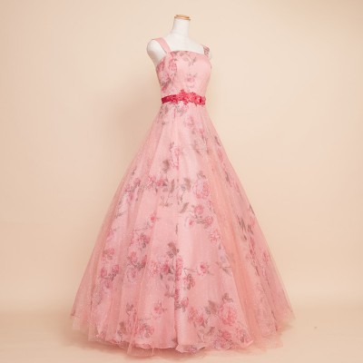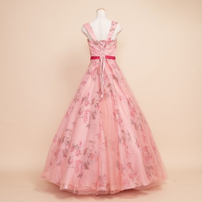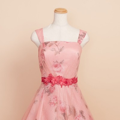 レトロなフラワー柄を配した乙女チックなAラインドレス。すっきりとしたクラシカルなシルエットにキラキラと光る細やかなグリッターを散りばめ、品がありながらもしっかり華やかさをプラス。ステージドレスや花嫁様のお色直し、2次会衣装にもおすすめです。レトロな風合いが魅力のコーラルピンクカラー。