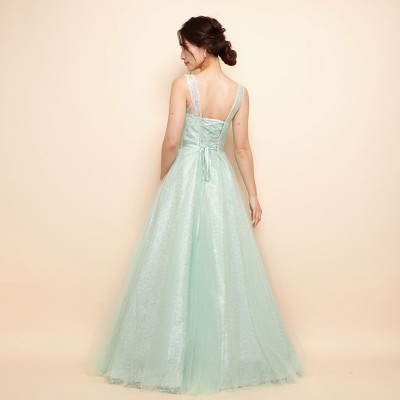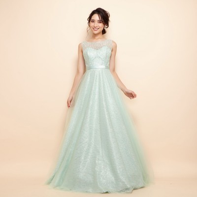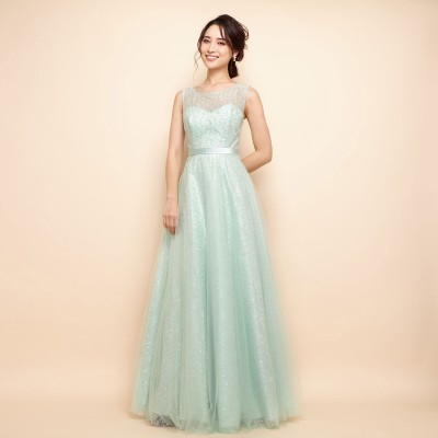 美しい細身シルエットのAライン総レースドレスです。ラメ糸を使ったレースにはミントカラーのスパンコールが縫い込まれており、ライトの下では上品で繊細な輝きを放ちます。スレンダードレスのようなデザインですが、1本ワイヤーパニエも使用できるしっかりとしたフレアスカートが魅力。ステージドレスにもパーティドレスにも幅広くお使いいただけます。清涼感ある大人なブルーミントカラー。
