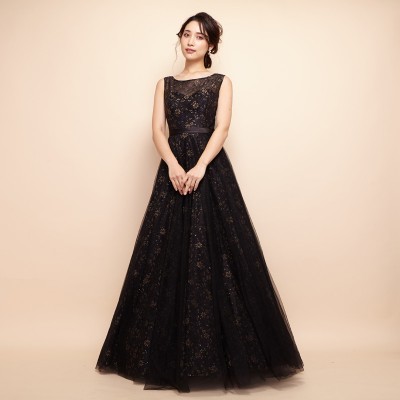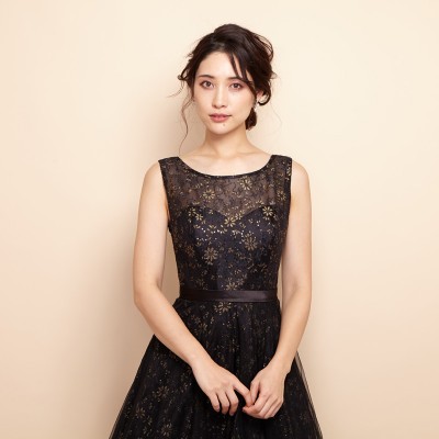 美しい細身シルエットのAライン総レースドレスです。ゴールドラメ糸をアクセントに使ったレースにはシックなブラックカラーのスパンコールが縫い込まれており、ライトの下では上品で繊細な輝きを放ちます。スレンダードレスのようなデザインですが、1本ワイヤーパニエも使用できるしっかりとしたフレアスカートが魅力。ステージドレスにもパーティドレスにも幅広くお使いいただけます。気品あるブラックにアクセントのゴールドがさり気ない、大人可愛いブラックドレスです。