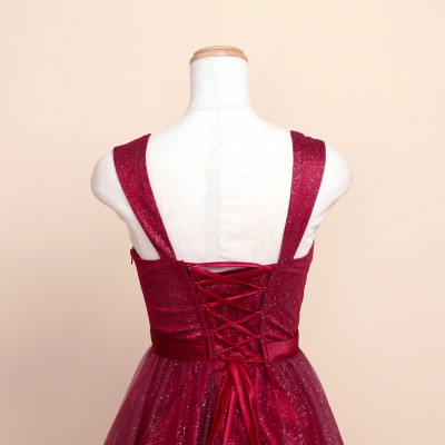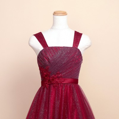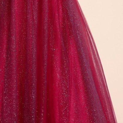 片側のチュールにはグリッターが吹き付け加工されているので、ライトの下ではキラキラと光りステージをより華やかにしてくれます。ピアノなどの発表会用ドレスとしても、記念日のドレスにもおすすめです。