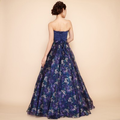 光沢のあるオーガンジーにクラシカルなフラワープリントが華やかなステージドレス。シックなカラーに浮かび上がるパープルフラワーがアクセントの、大人の女性にぜひ着ていただきたいエレガントなデザインが魅力です。