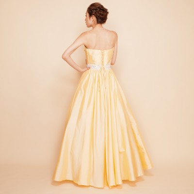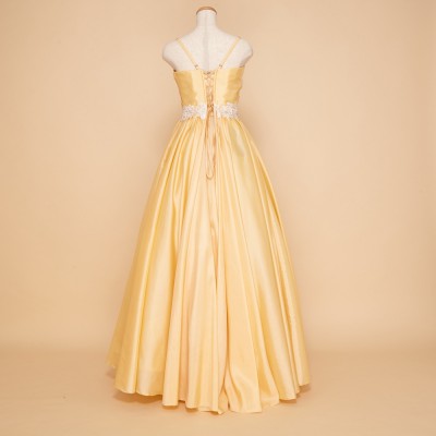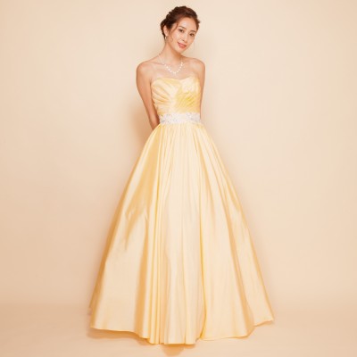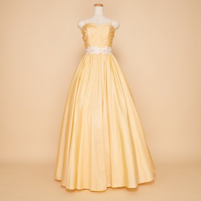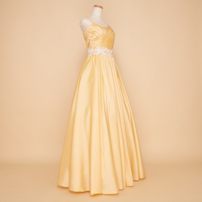 定番大人気の演奏会ドレス。気品あるクラシカルなデザインのAラインドレスです。ギャザーをふんだんにあしらったスカートは、ボリュームパニエを使えばさらに豪華にみせる事も可能。ドレスを初めて着る方にも扱いやすい、丈夫なタフタ生地を使用しています。明るく華やかなイエローにアイボリーのレースビーズベルトを合わせています。演奏会、パーティーなど華やかに場所にどうぞ!